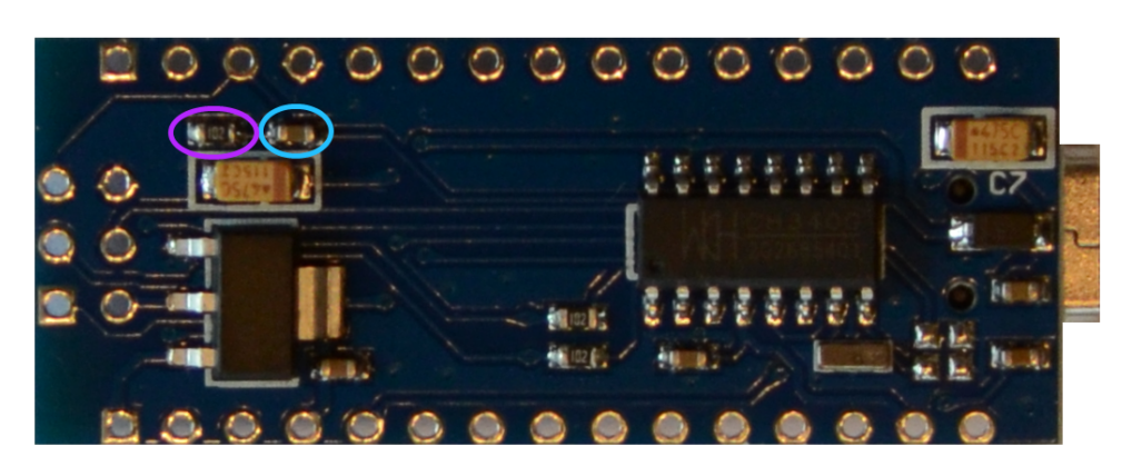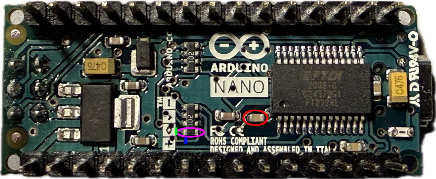 Things are a bit more complicated with Arduino Nano boards. Here, you not only have to remove the auto-reset capacitor but also a strong pull-up resistor of 1kΩ on the RESET line. The following picture shows the bottom side of an Arduino Nano V3.3. The capacitor to be removed has been marked by a red ellipse, the 1kΩ resistor by a magenta one. Since this resistor is part of a resistor array, one needs to cut the trace instead. If you manage to cut the trace at the point marked by the green line, everything is fine. If you are not able to accomplish that, cutting at the point marked by the blue line is also OK. In this case, the power LED will also be cut off. In any case, after this modification, this board will probably only be usable for debugging purposes.