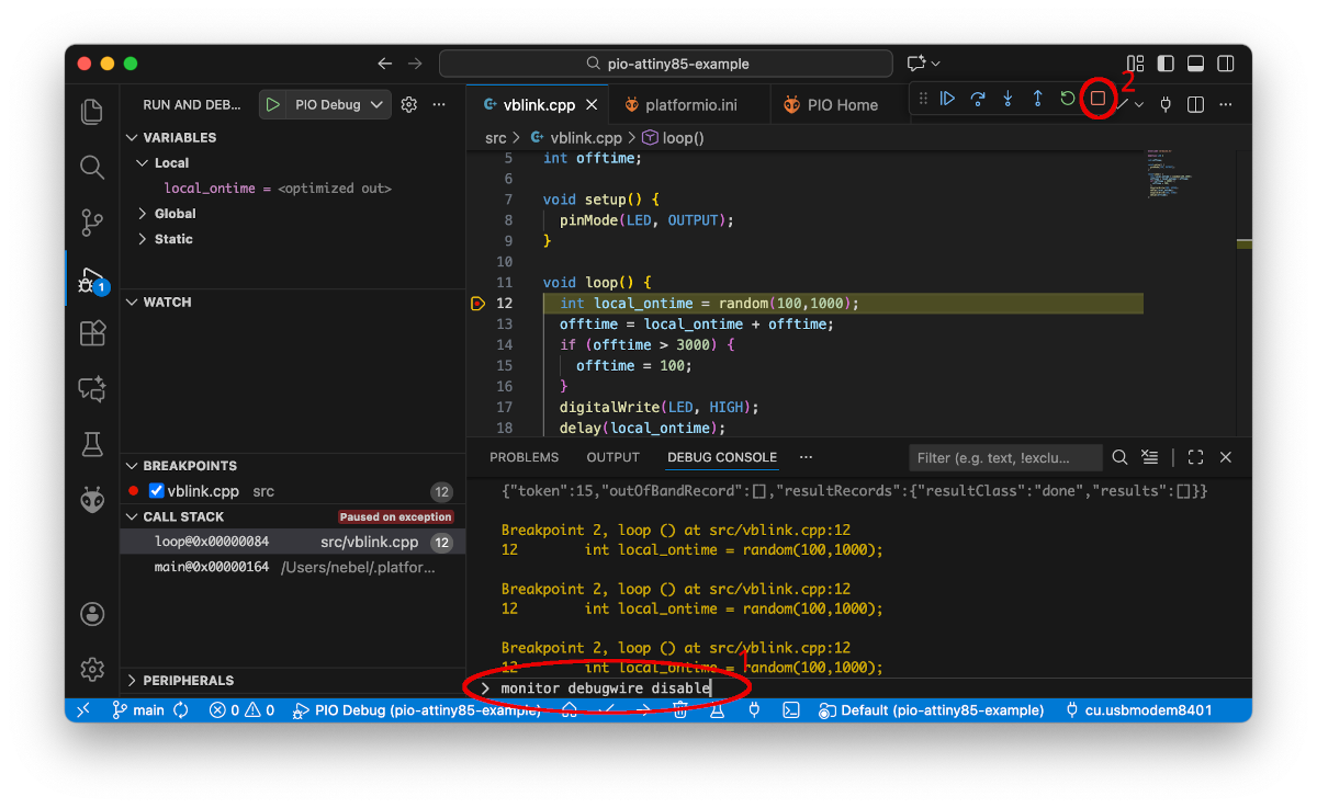 Instead of starting a new edit/compile/debug cycle, you may want to call it a day and end debugging. In this case, you may wish to switch the MCU back into normal mode, in which ordinary SPI programming is possible. This can be accomplished by typing the command monitor debugwire disable into the input line of the DEBUG CONSOLE window (1) just before terminating the debugger (2).